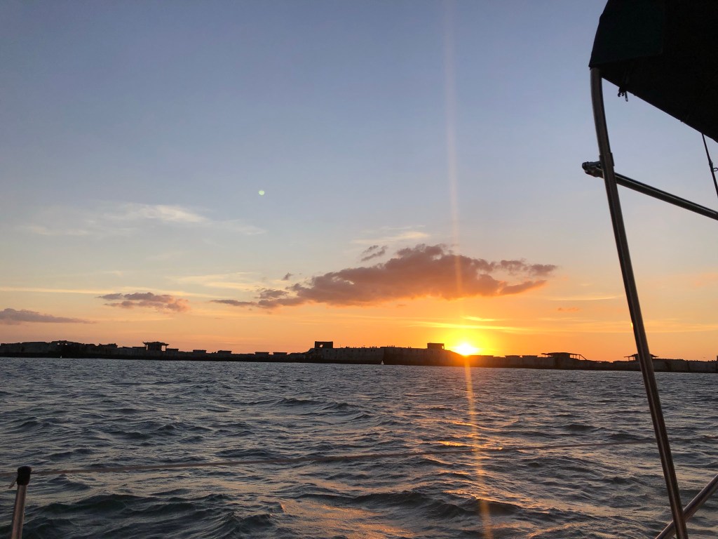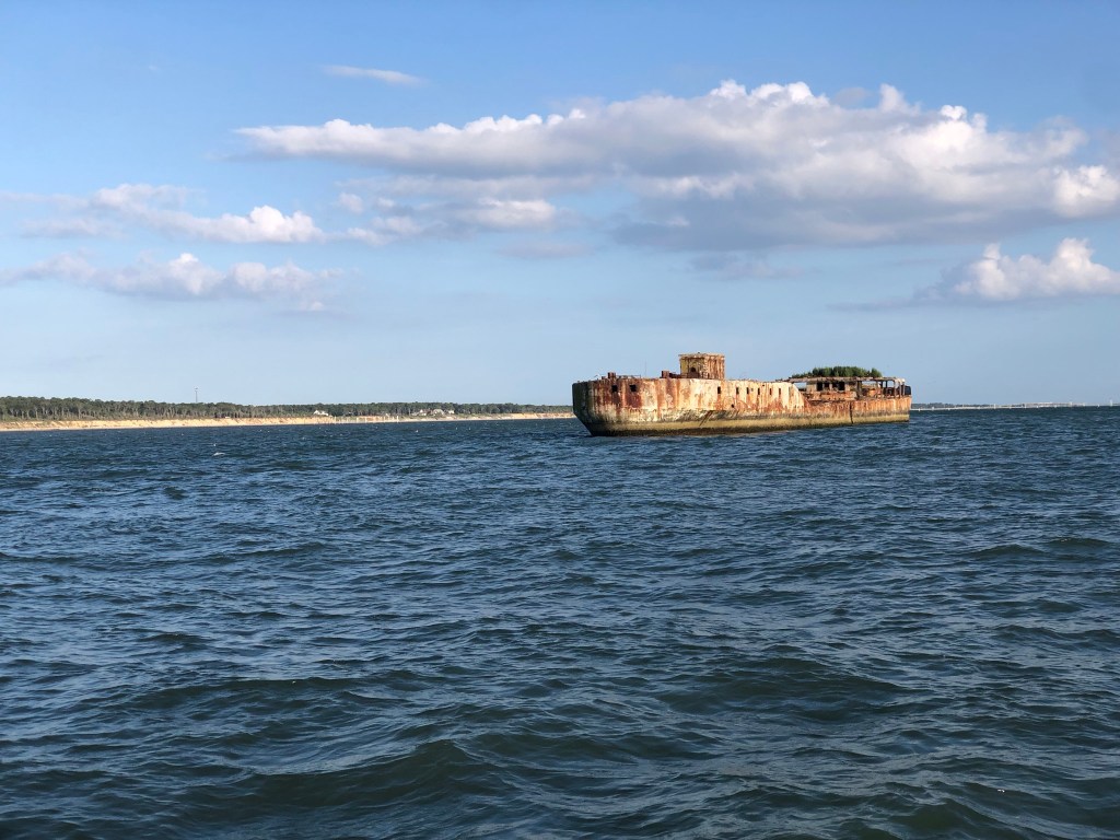 One of the coolest things that happened on our way? We saw a sea turtle! Steve asked if I could use the binoculars that I was using to try and find the Concrete Ships when en route, to see what something was in the water. As soon as I turned Steve exclaimed: “That’s a turtle!” The turtle then blew water out and dove back under the water. We were on a high for a while, I might even say we still are, from this sighting! I think this was one of my favorite things that happened on this trip, or ever. We still can’t believe it. The turtle was huge. It’s back had to be at least the size of the helm. Steve scrambled to grab his phone and snap a picture, but the turtle was faster than us. Once we get our GoPro setup then hopefully we’ll be able to catch these magical moments, including the frequent dolphin sightings!