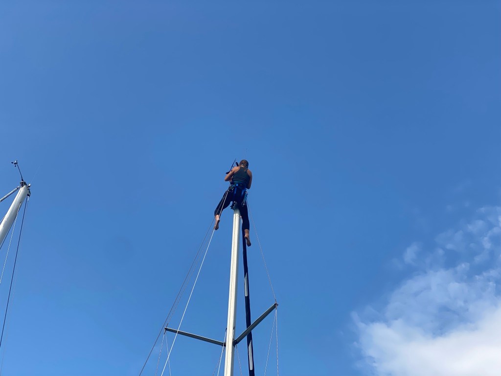 This week, Steve finished his first week at a new job. Woot woot! We finally got to fixing the jib and putting the wind vane up. Steve actually cranked me all the way up with the halyard attached to a climbing harness I was wearing. Fun fact: I didn’t even touch the jib. Apparently, it had shook itself loose from whatever was catching it and causing it not to unfurl. I did get the vane up which is important, so it wasn’t for nothing. It was definitely a cool experience being at the mast’s view of our boat.