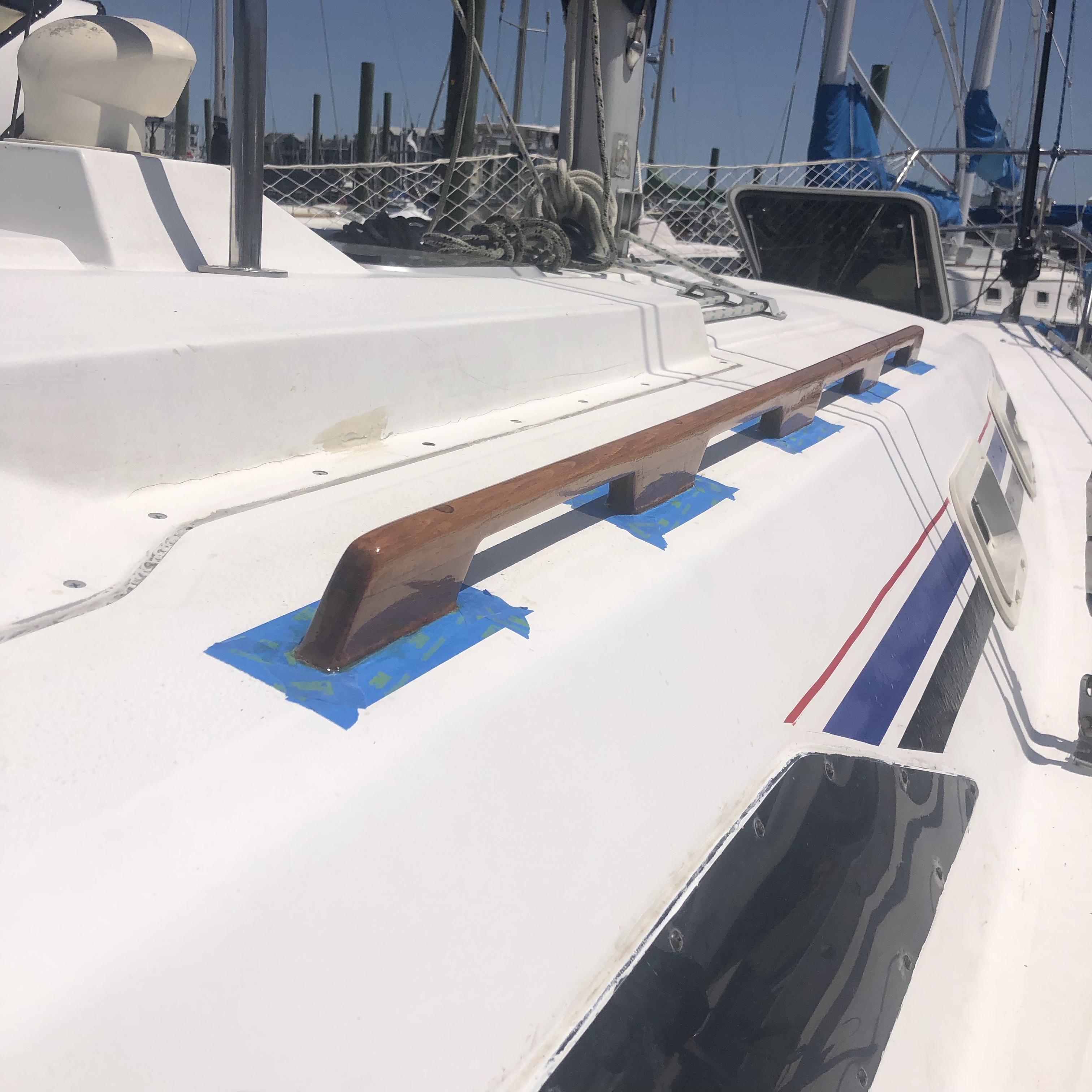 Unfortunately, there was no sailing in this week’s adventures, but I did get quite a bit of work done on it! The varnish is DONE. I only put a couple of coats on it since I redid it completely last summer, so it didn’t take long. One good sanding job, a couple rubs of teak oil, a coat of varnish, another sanding sesion, and one more coat and BOOM – done. And let me just say, varnishing is an instant gratification. It’s plain and sanded and doesn’t look great and then you put a coat on and it upgrades your wood x100000. Clearly, I’m pretty proud of it. We’re working on getting the boat set for visitors (whenever that is) so I’m hoping to get it back in ship shape! We’ve also started to fix the paddle board where the fin scraped the pilon and it messed up, so that is a work in progress.